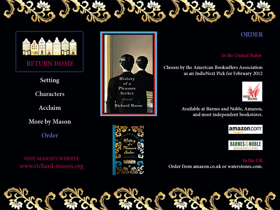 Return Home Visit Richard Mason's website More by Richard Mason Acclaim for History of a Pleasure Seeker Characters of History of a Pleasure Seeker Setting of History of a Pleasure Seeker History of a Pleasure Seeker at amazon.co.uk Available at Barnes and Noble Booksellers History of a Pleasure Seeker History of a Pleasure Seeker at Amazon.com Purchase "History of a Pleasure Seeker" from IndieBound